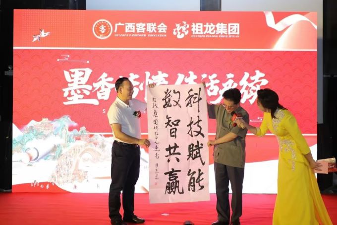 广西书画院院长韦克义在会上向广西客联会和祖龙集团赠送了书法作品