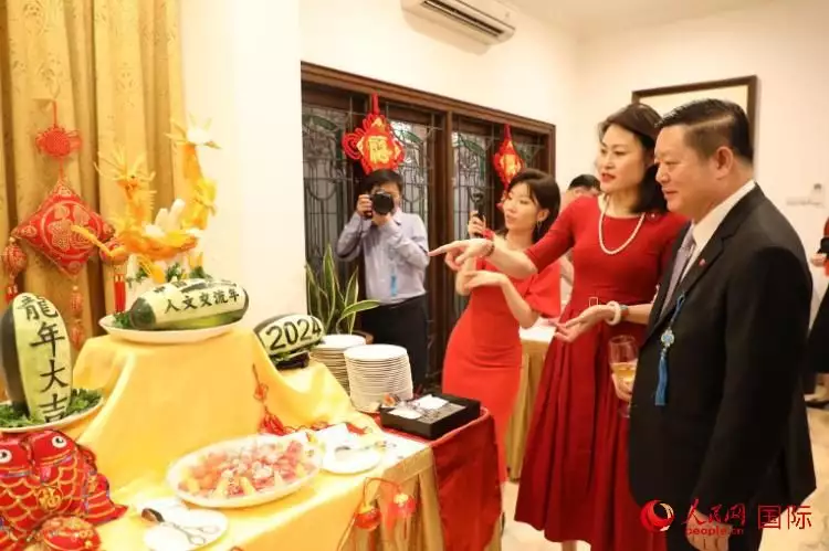 招待会现场洋溢着热烈、喜庆、温馨的气氛。侯艳琪及使团外交官和来宾们一起包饺子、写福字,欣赏食雕、花馍等传统技艺,感受博大精深的中华文化,互致诚挚的新春祝福,祝愿中国东盟“五大家园”建设在农历龙年取得更大成就。