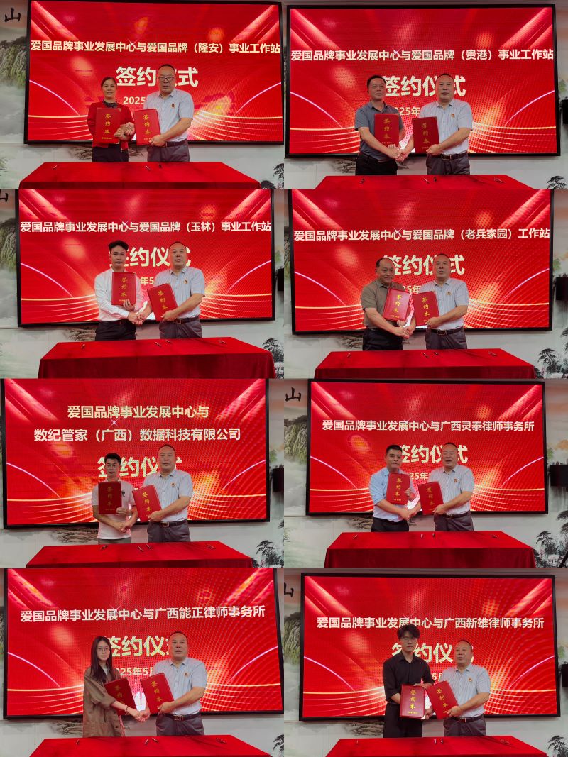 现场还举行了爱国品牌事业发展中心与隆安、玉林、贵港、老兵家园工作站、数纪管家(广西)数据科技有限公司、广西灵泰律师事务所、广西能正律师事务所、广西新雄律师事务所等事务所的签约仪式。